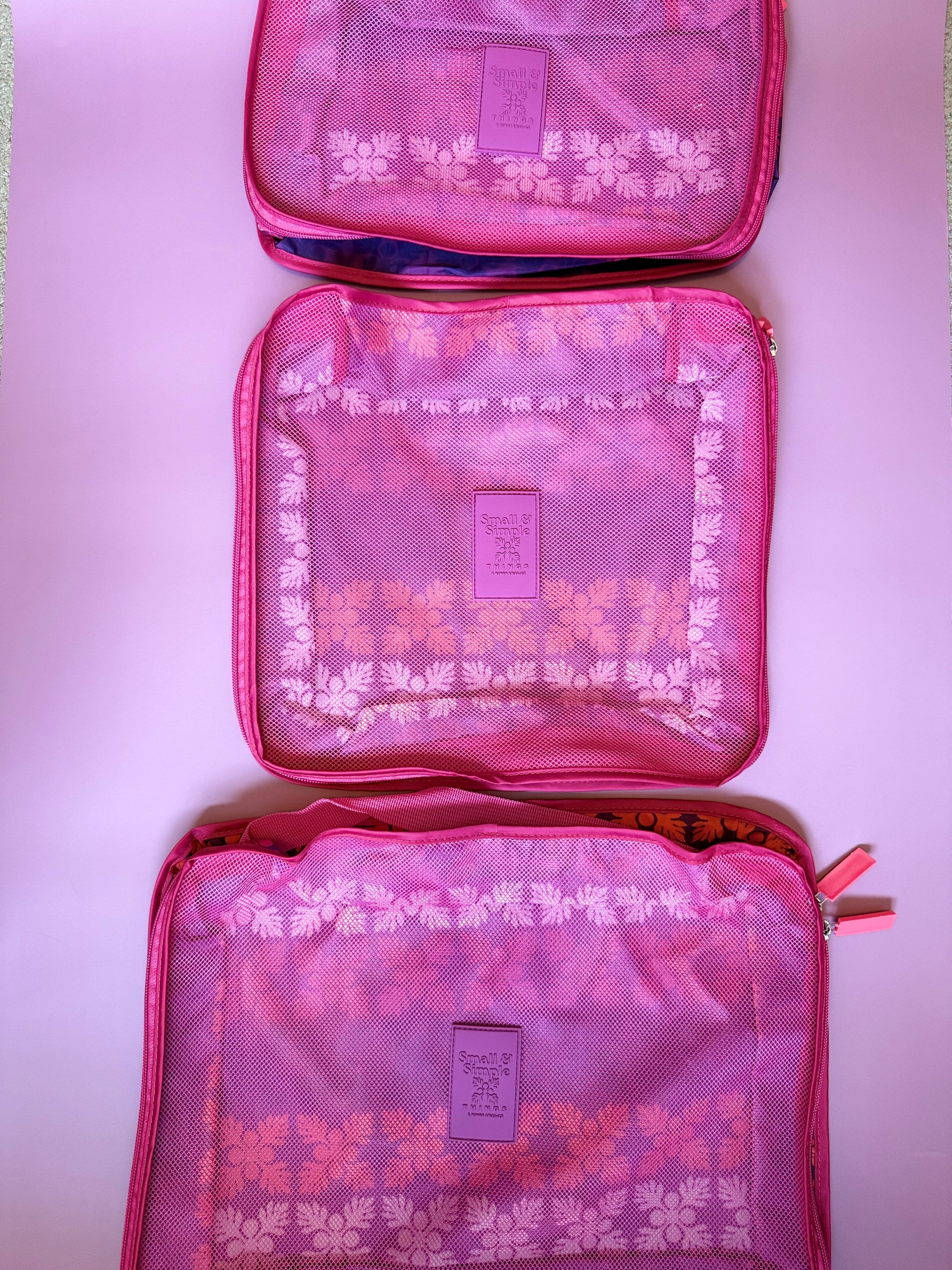 Travel cubes in a three piece set. Nylon fabric on one side and mesh on the other side. Three different sizes are included.
