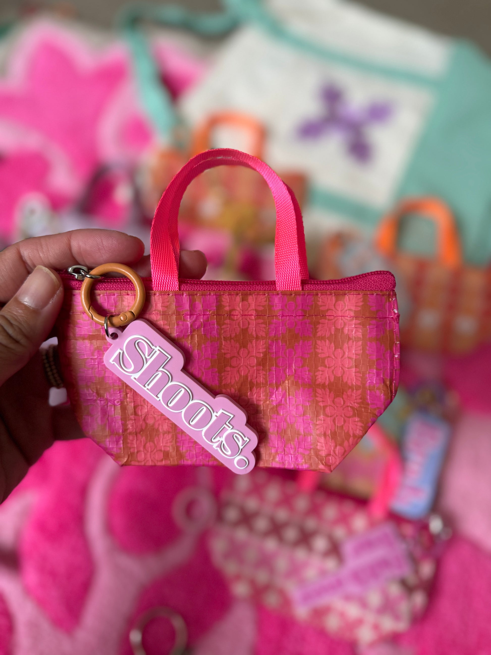This listing is only for the bitty Bucha in our orange and pink kuiki design. All other accessories are sold separately. This mini bag comes with a silver clip to attach it to your keychain. The bitty bag measures about 4-5 inches long.