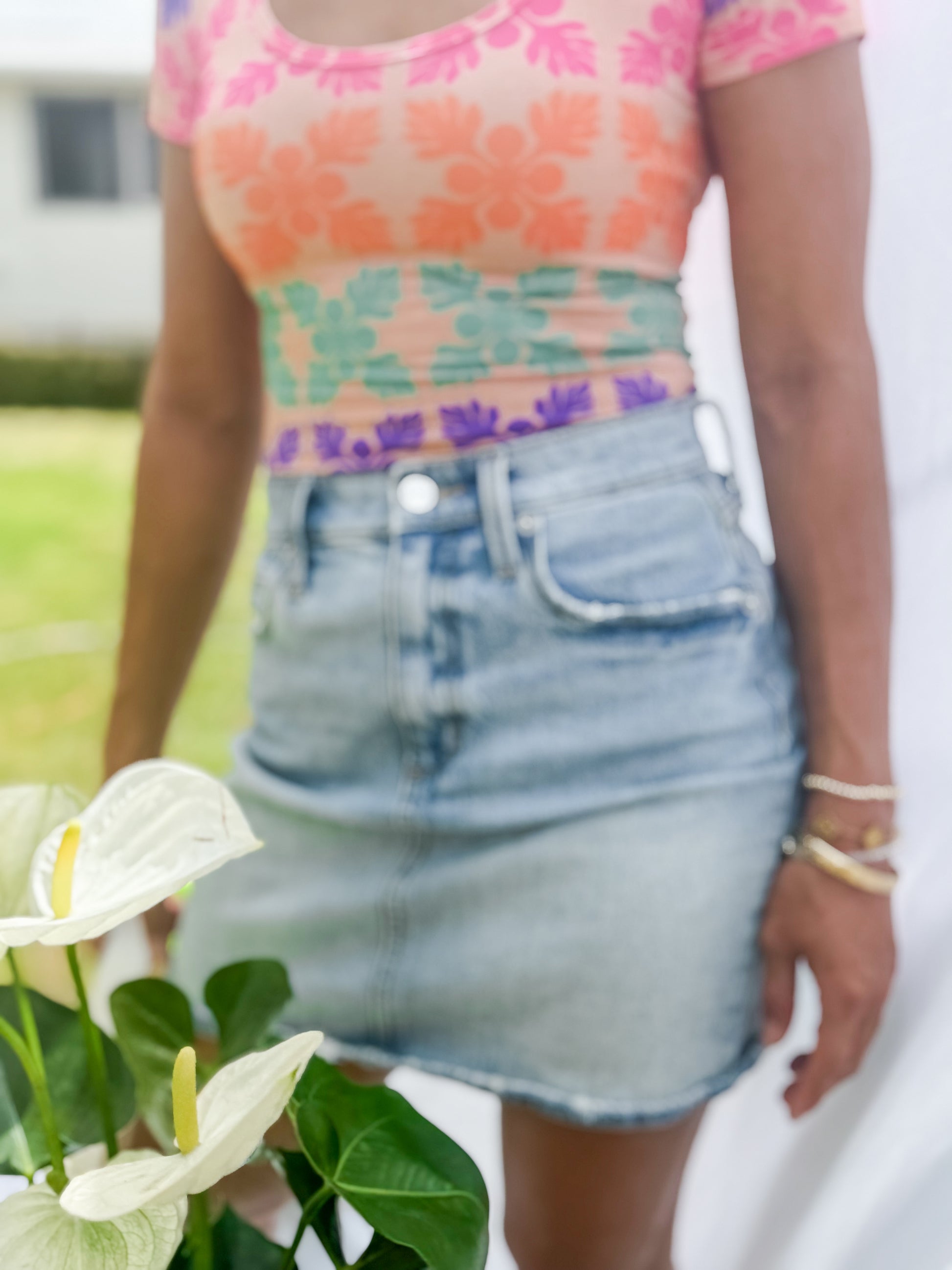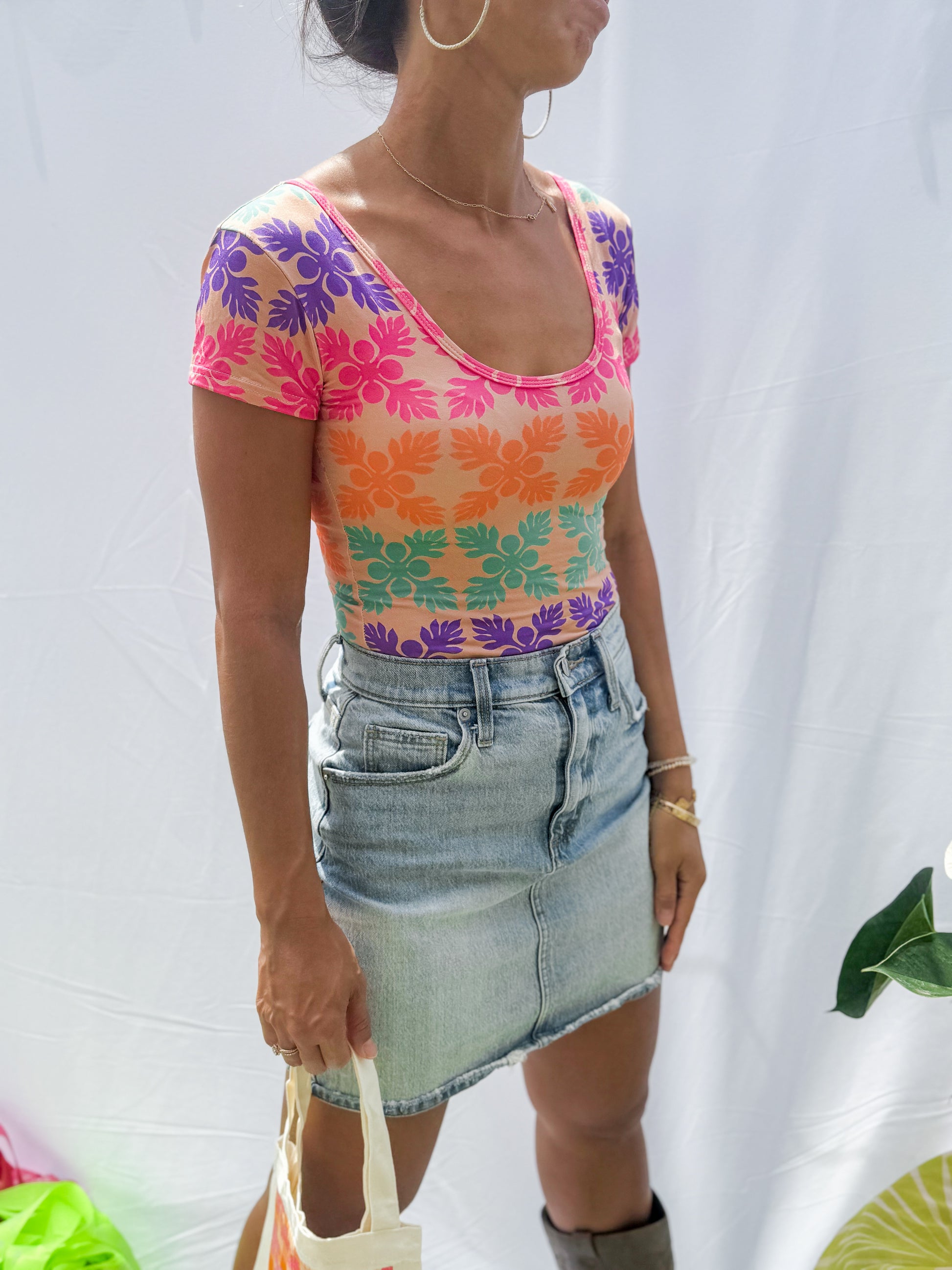 Soft stretchy bamboo cotton material. U shaped neckline front and back. Snap button enclosure on the bottom. Person on the left is wearing a size XS and person on the right is wearing a size medium. All sales final